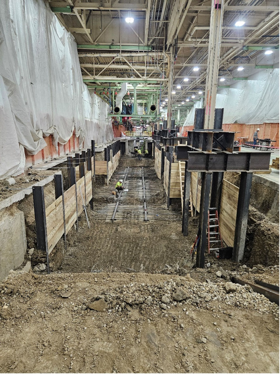 Steel beams or piles are driven vertically into the ground, with horizontal lagging (typically timber or precast concrete) added to spread soil pressure to the support beams and prevent soil from falling through gaps.